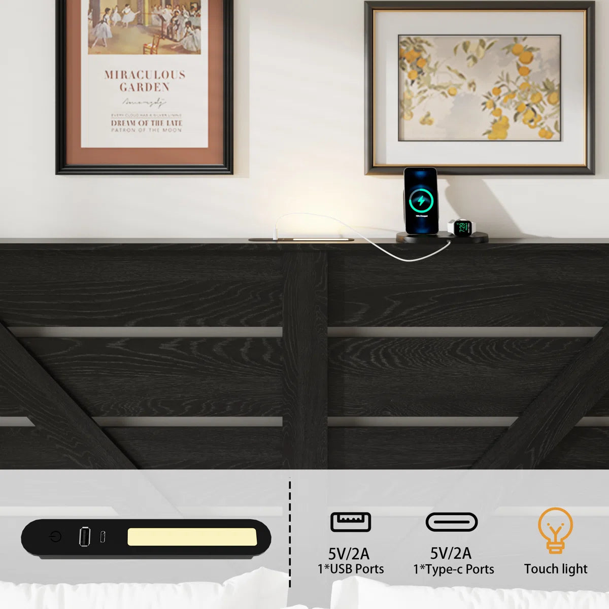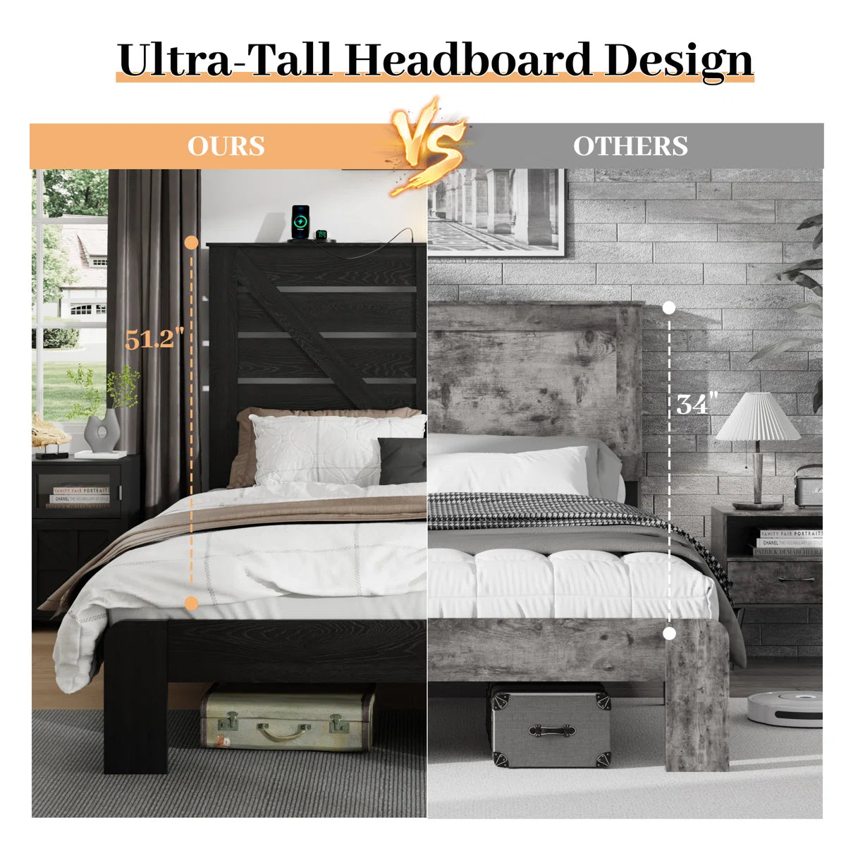 Farmhouse Bed Frame with Tall Headboard, Wooden Platform Bed Frame with Charging Station & Led Lights, King Size, Black! (NEW IN BOX)