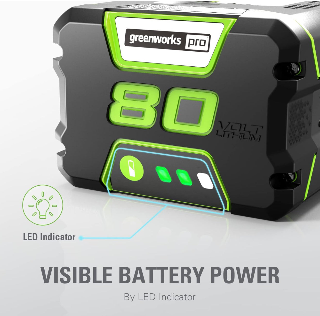-On board LED lights fuel indicator for on demand reference of remaining power. For use with Greenworks 80V most tools