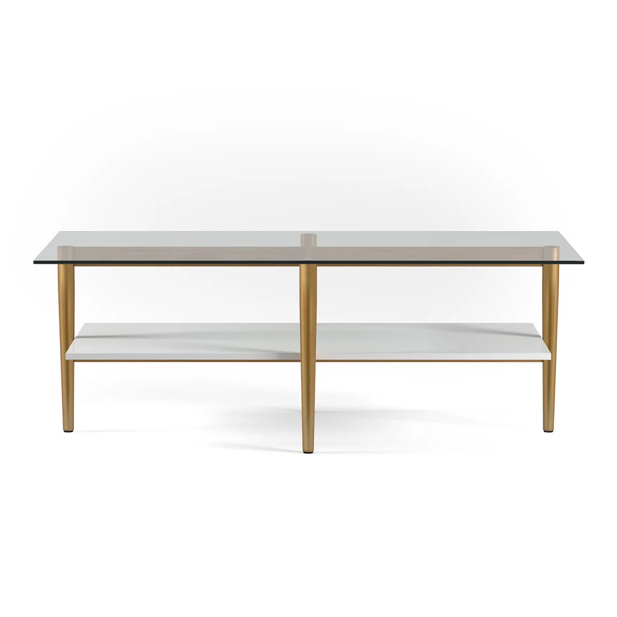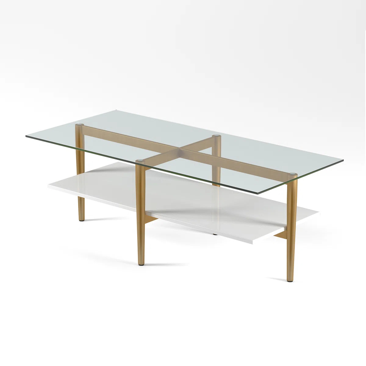 -Take this one, for example: Crafted from a combination of gold-finished metal and manufactured wood, this piece features a streamlined, open silhouette and is capped with a glass surface for a sleek, contemporary look with a mid-century glam twist.
