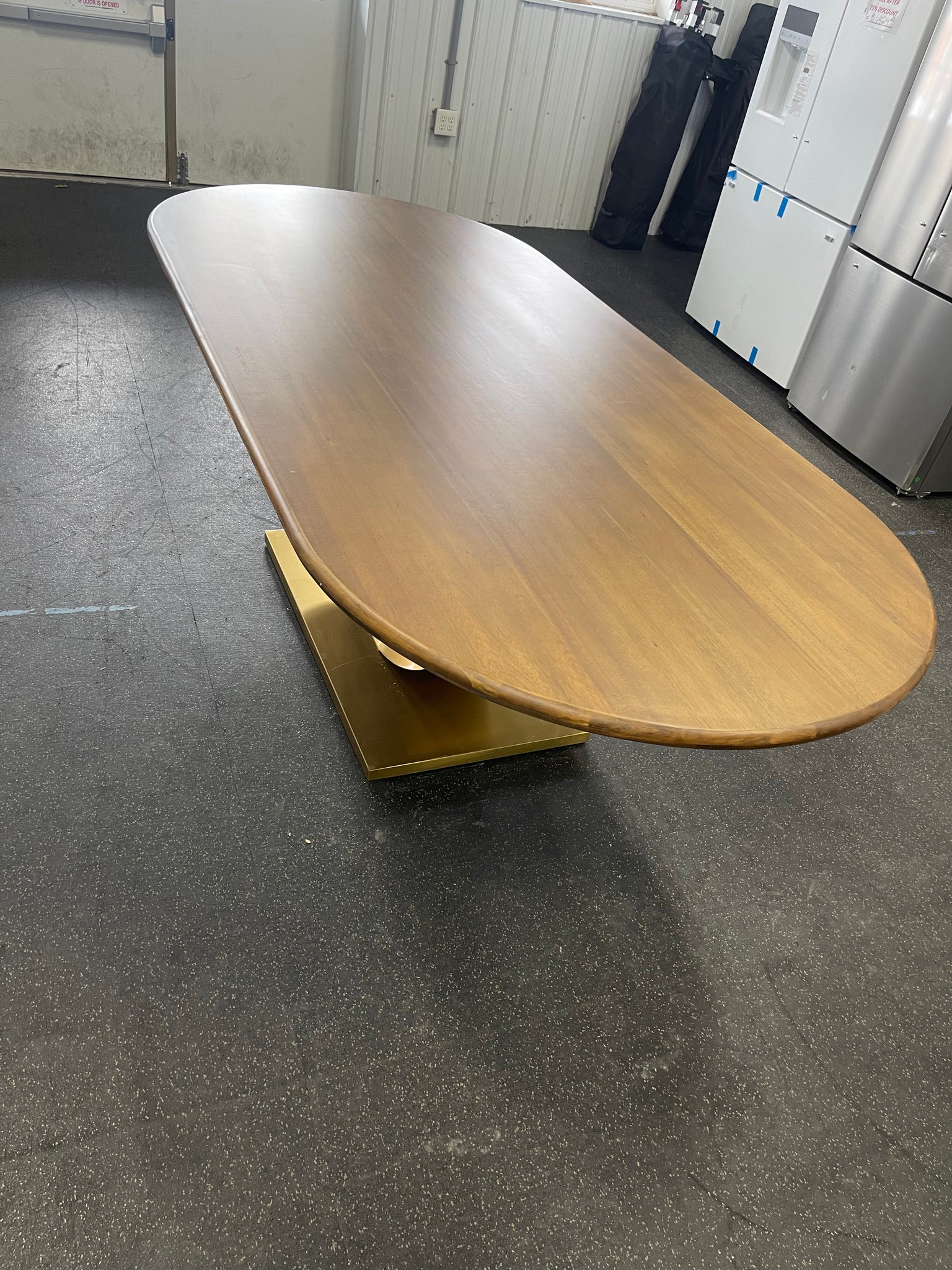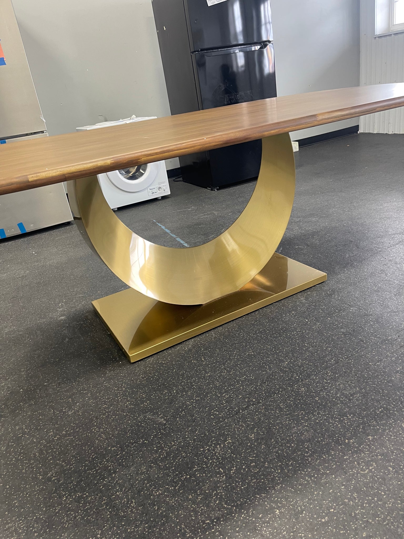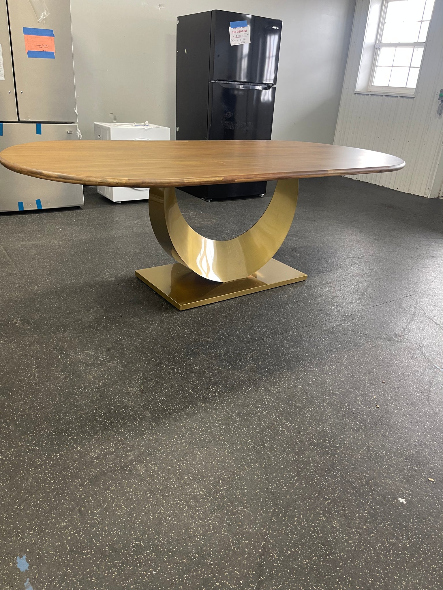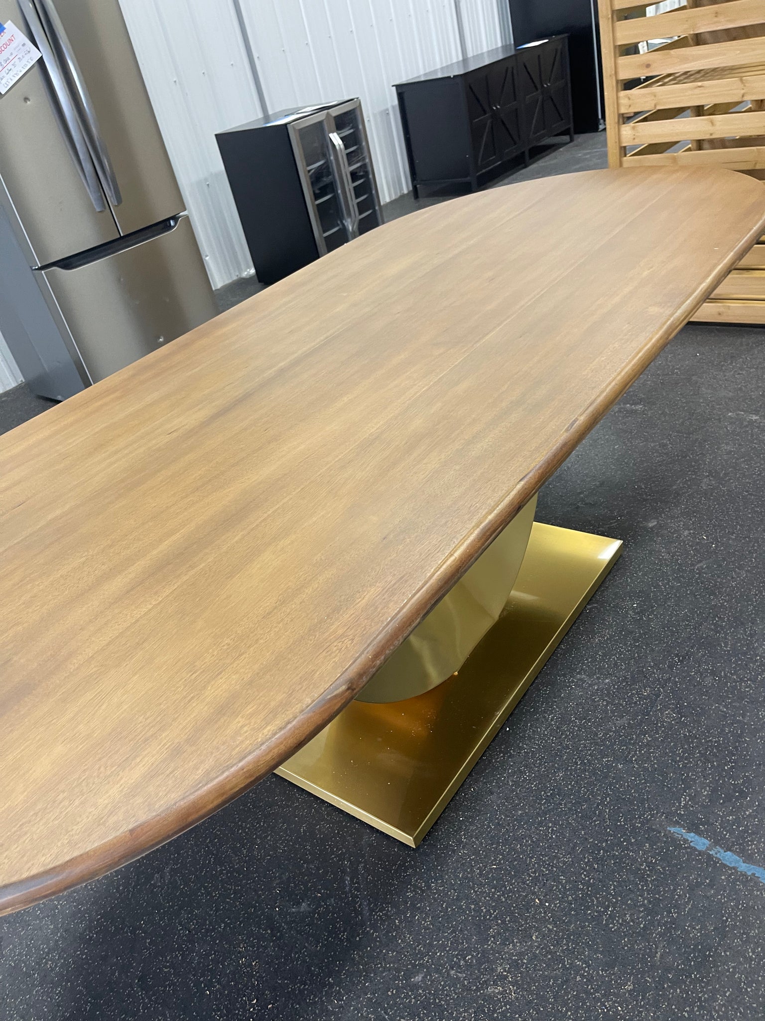 Gorgeous and unique solid wood dining table with massive fabricated brass finish steel base- new.