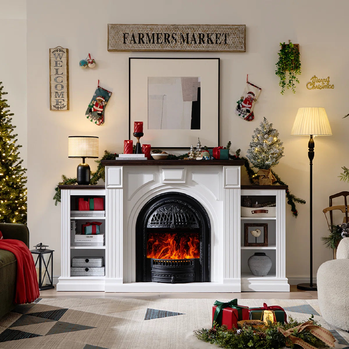 -Classic Carved Mantel with American Birdcage Farmhouse Style: Featuring a charming birdcage-style arch, fluted columns, and weathered wood textures, this mantel TV cabinet blends vintage elegance with modern rustic appeal. Finished in a soft white tone, it complements farmhouse, transitional, and traditional spaces.
