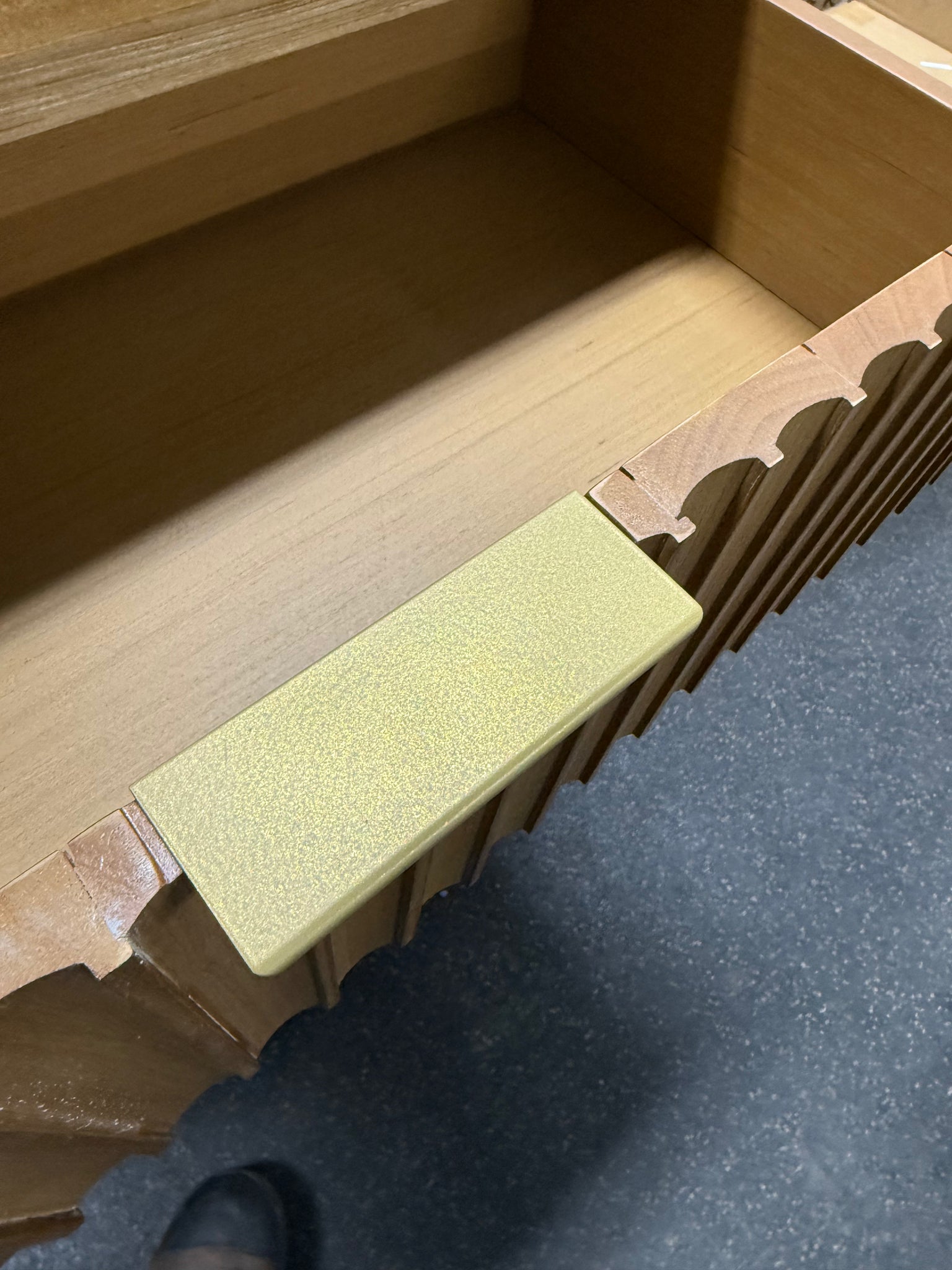 -Highlights beautiful fluted drawer fronts with elegant gold handles for that modern bohemian look