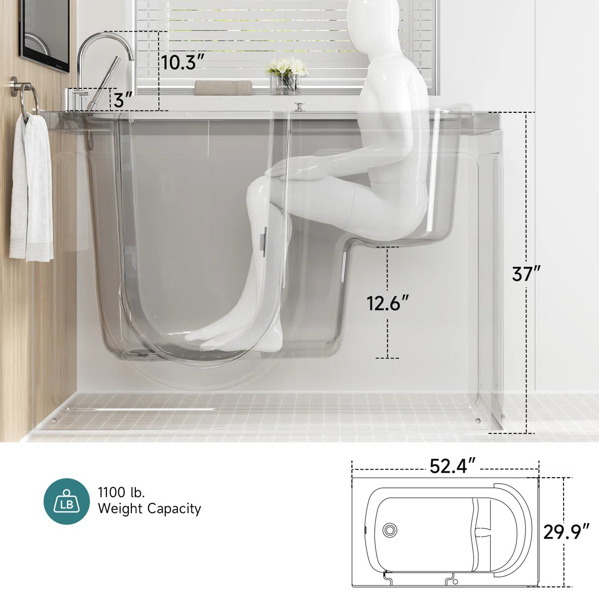 -This spacious 52"x30" walk-in tub features a sturdy 1,100 lb. capacity, providing secure and comfortable access for individuals with mobility challenges.