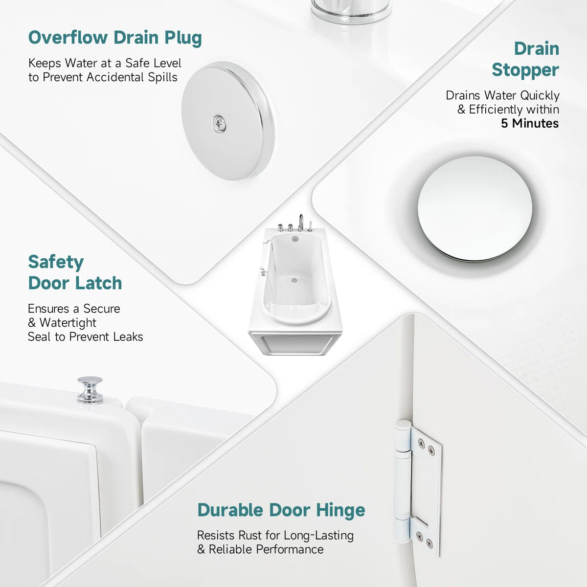 -The inward-swinging door offers smooth and easy access, ideal for tight spaces. A built-in safety latch ensures a watertight seal, preventing spills and keeping your bathroom floor dry.