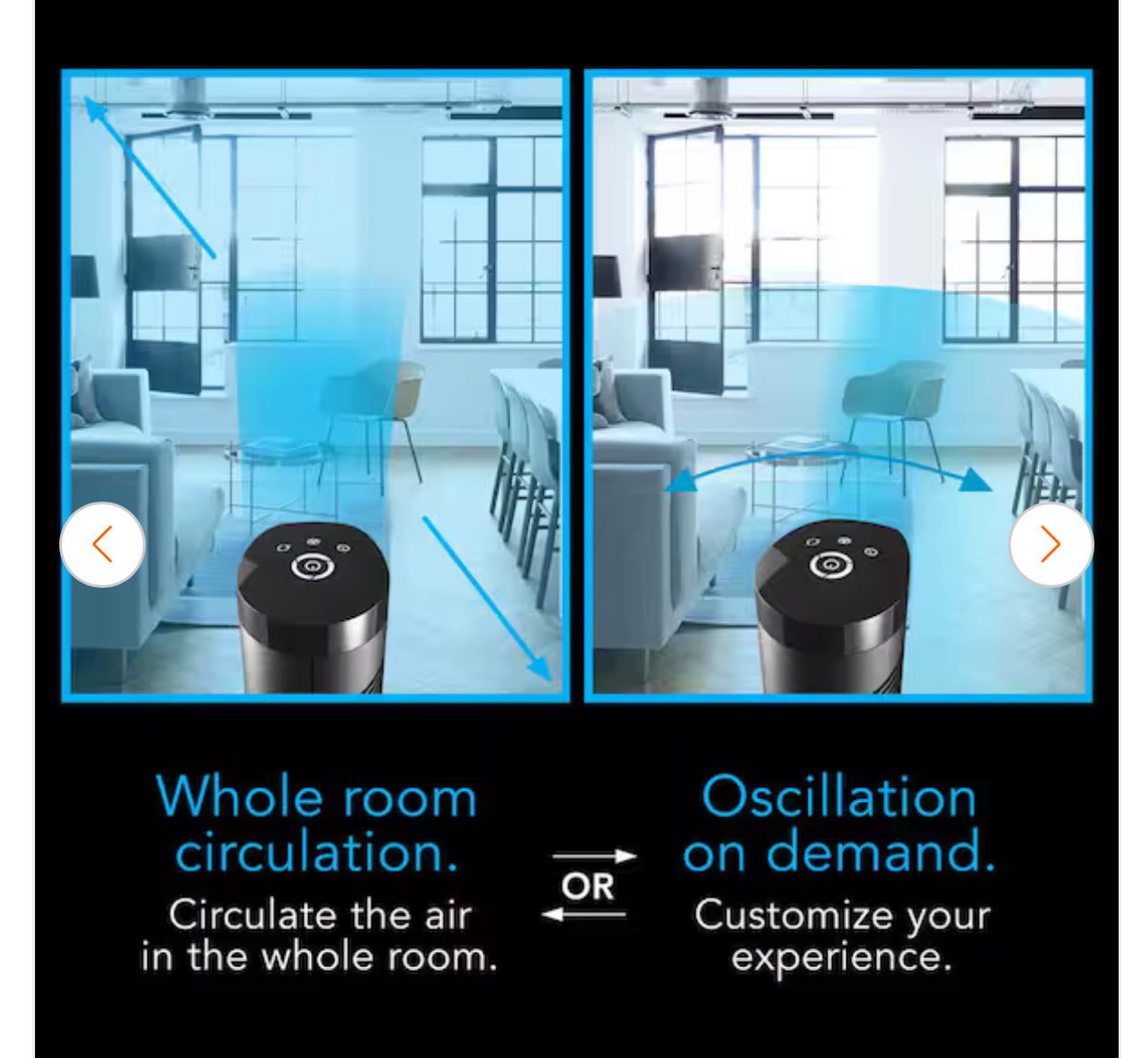 Vornado now offers two distinct ways to be comfortable: both from one beautiful product. Introducing OSCR37 - the Vornado Whole Room Tower Circulator with Oscillation On-Demand. Of course, OSCR37 delivers Vornado's signature whole room circulation - utilizing stationary, high-velocity airflow to continuously circulate all the air in the room. With whole room circulation, everyone in the room remains cool and comfortable - and that's only half the story. OSCR37 also offers a second option: oscillation mode - sweeping the room with cooling beams of high-velocity airflow. Designed for smooth, quiet oscillation and embellished with a chromed carry handle, the OSCR37 would be a beautiful and functional addition to any space. There are those that have experienced the constant comfort of whole room circulation. There are those that enjoy the sweeping air experience of oscillation. OSCR37 delivers the best of both worlds. Doesn't it feel good to have options.