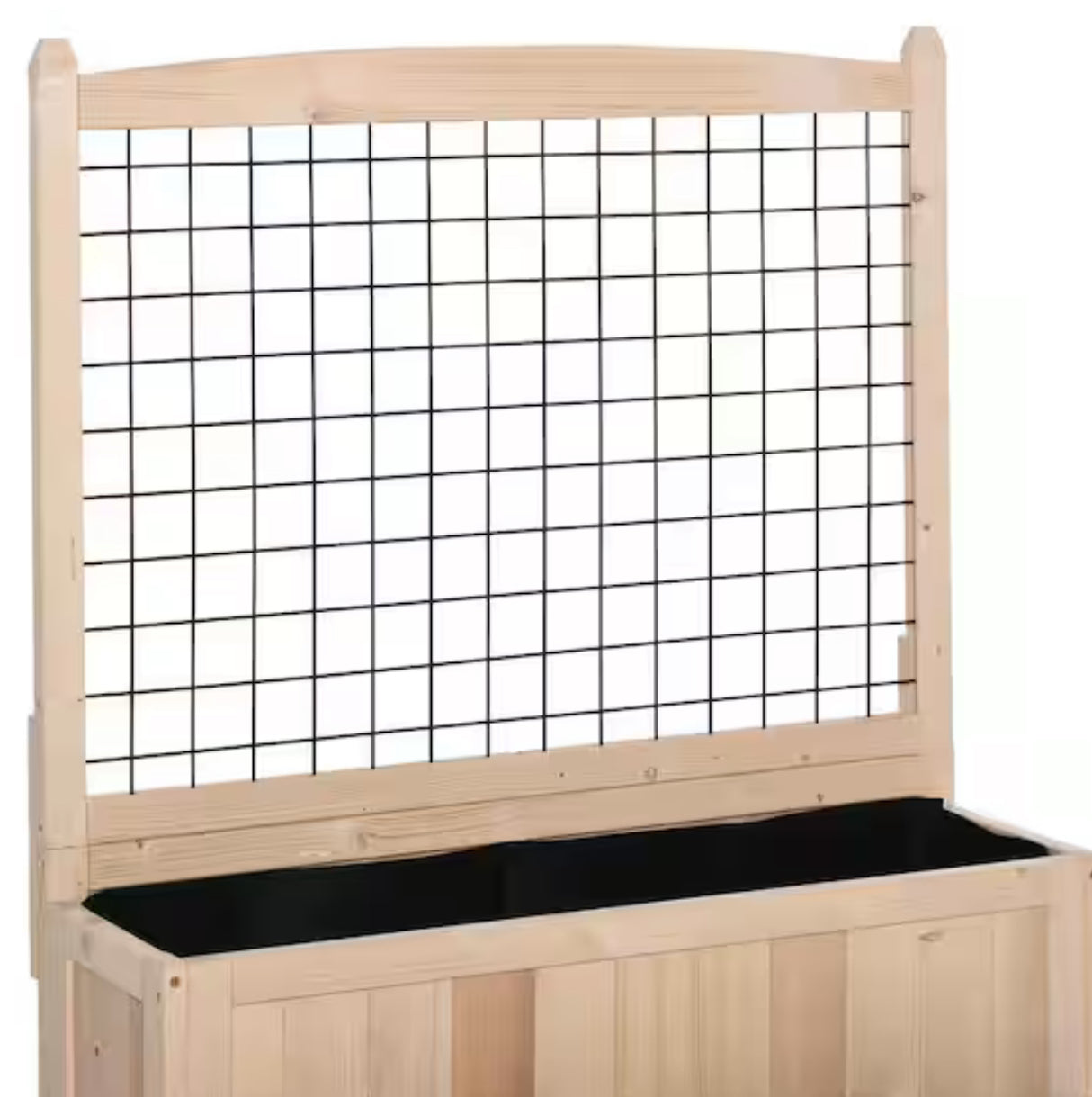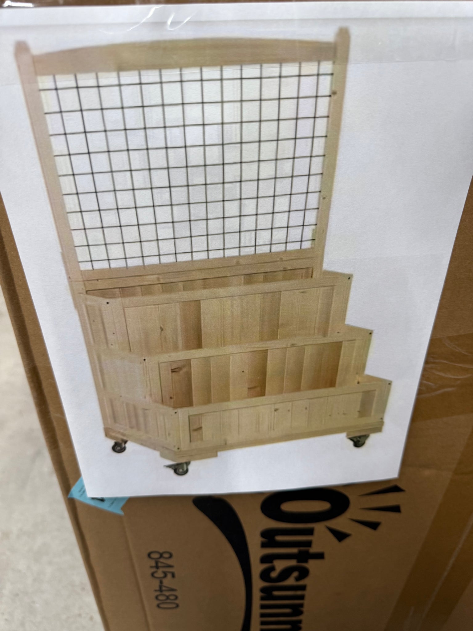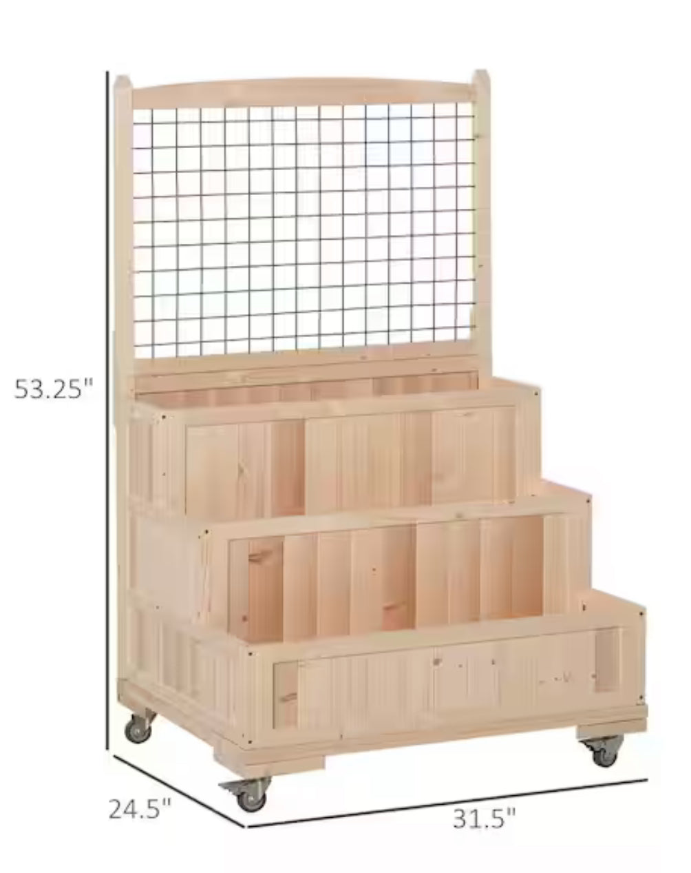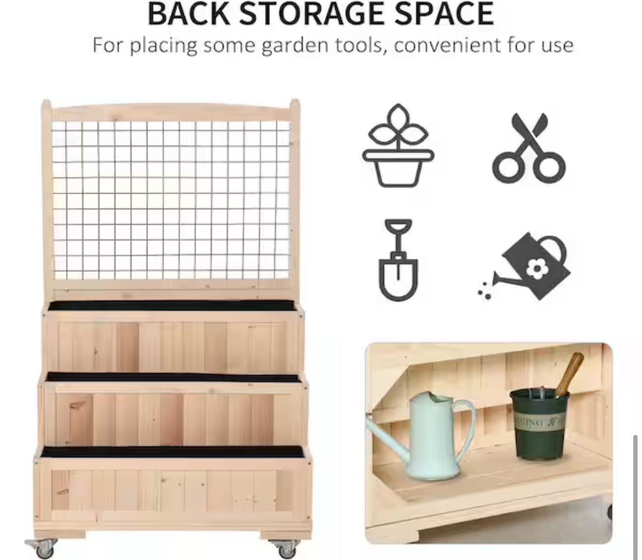 Outsunny 3-Tiers Natural Wooden Raised Garden Bed with Wheels, Trellis, Back Storage Area Easy Movable! (NEW IN BOX)