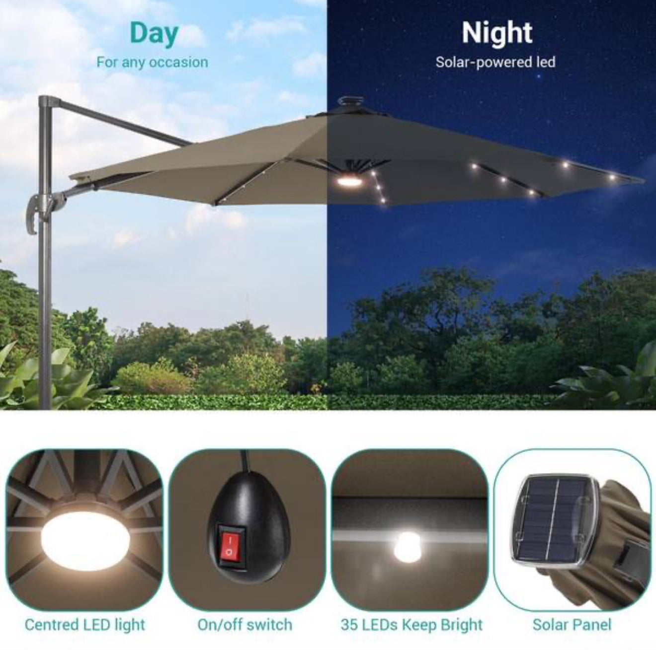 -Solar-powered brilliance our 11 ft. patio cantilever umbrella embraces eco-friendly technology with a solar-powered panel that illuminates 35 built-in LED light bulbs these energy-efficient lights create a warm and inviting ambiance
