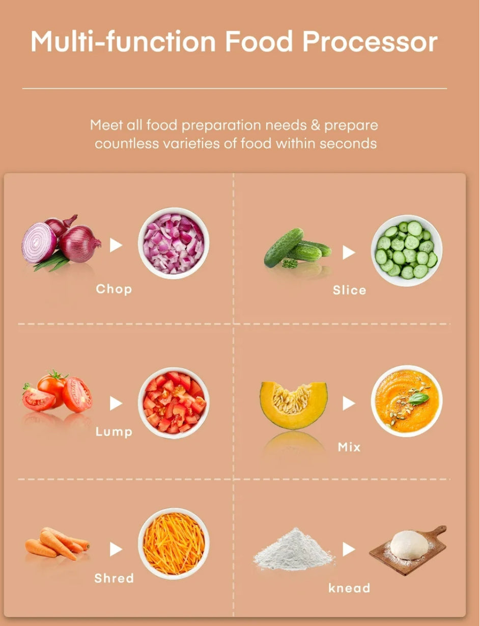 【Multi-Functional Food Processor】Professional versatility performance; stainless steel S-blades slice/reverse shred disc and plastic S-blade deliver restaurant-worthy results. It's easy to use and makes quick work of everyday chopping, grinding, pureeing, and mixing! Chop fruits, vegetables, meat, and bread, mix up relishes and blend up dips and sauces, and make dough;