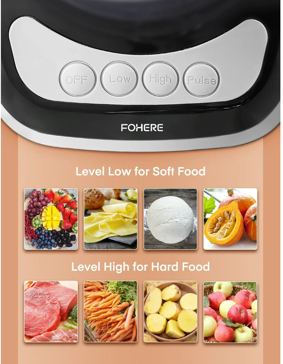 【Food Prep In Seconds】large feed chute no need to prepare foods to struggle with multiple tools, choppers, and heavy equipment when this food processor can do everything for you in less than 30 seconds. 800 Peak Watts Powerful motor with 2 speeds plus pulse control, gives you precise control to produce coarse or fine results.