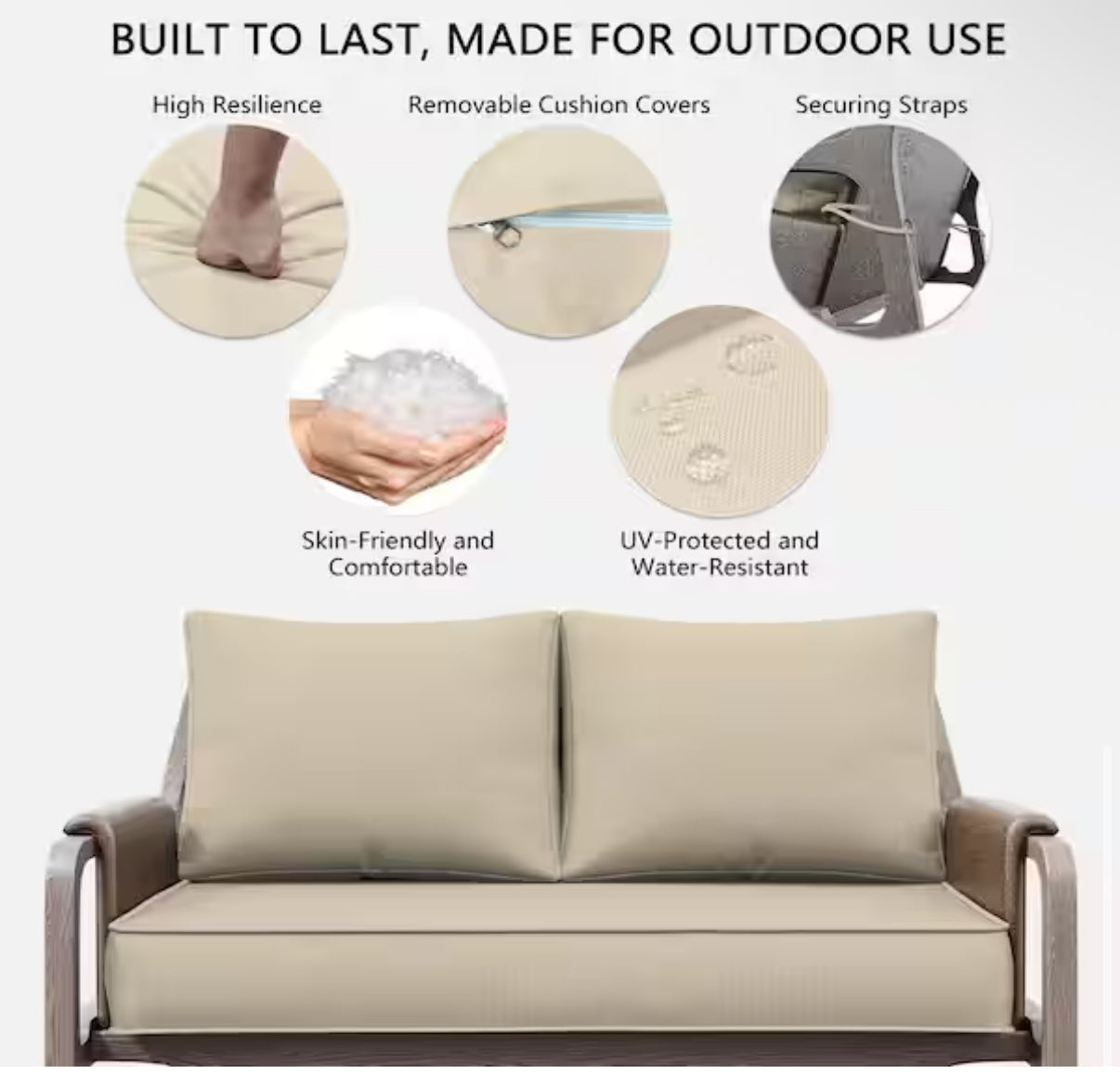 -100% polyester-our sofa cushions are crafted from 300 GSM high-density polyester fabric, offering a combination of softness, durability, breathability, and skin-friendliness, thanks to superb coloring technology, their resistance to fading is 20 times that of ordinary products, in addition, the deck cushion cover is splash-resistant, with water just beads on the cover and can be quickly brushed off with a towel, we recommend storing or covering cushions during rain, inclement weather, and winter to prolong the life of the cushions