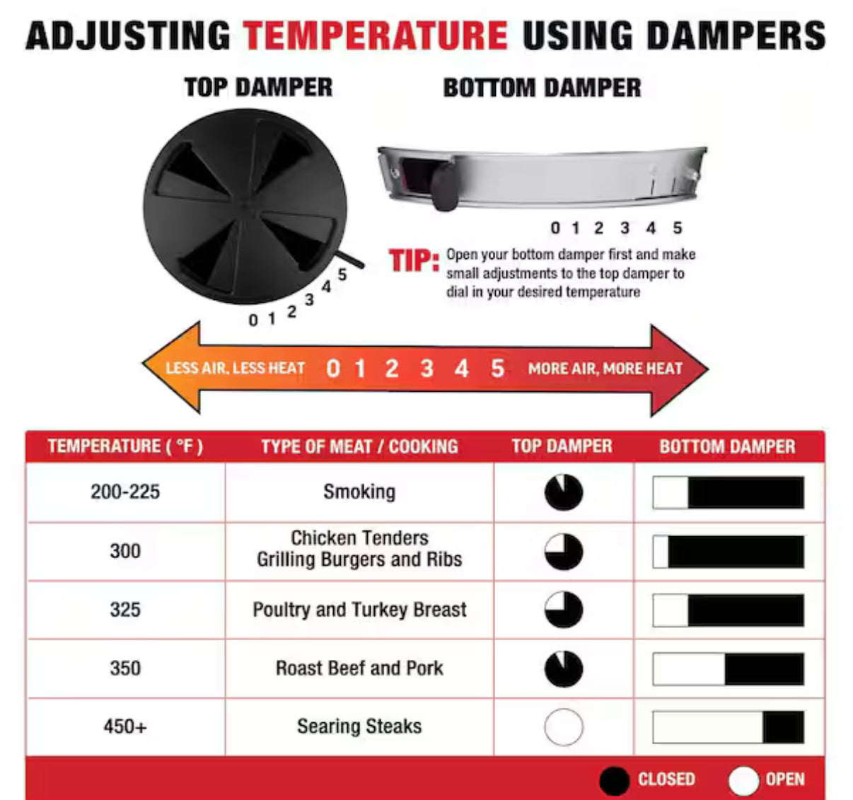 -Dual adjustable dampers for maintaining desired grilling or smoking temperatures