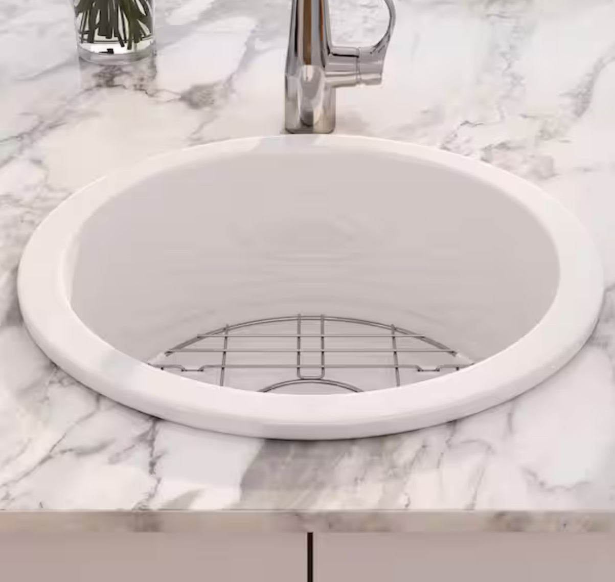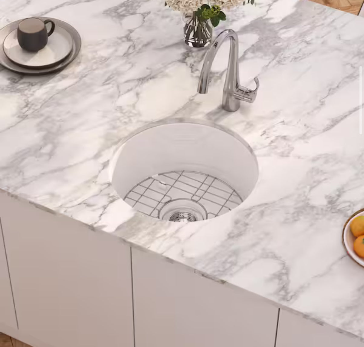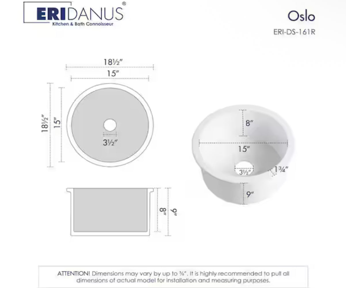 Eridanus Oslo 18.5 in. Drop-In/Undermount Round Single Bowl in White Fireclay Kitchen Sink with Bottom Grid and Basket Strainer!! NEW IN BOX!!