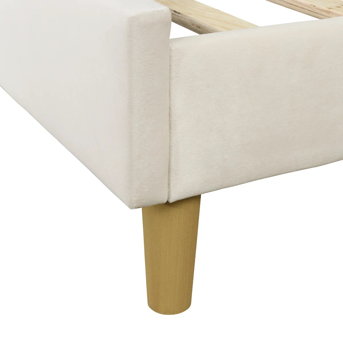 -The frame is built from engineered wood, and it rests on splayed legs with a light brown finish. This bed is upholstered in linen and/or velvet