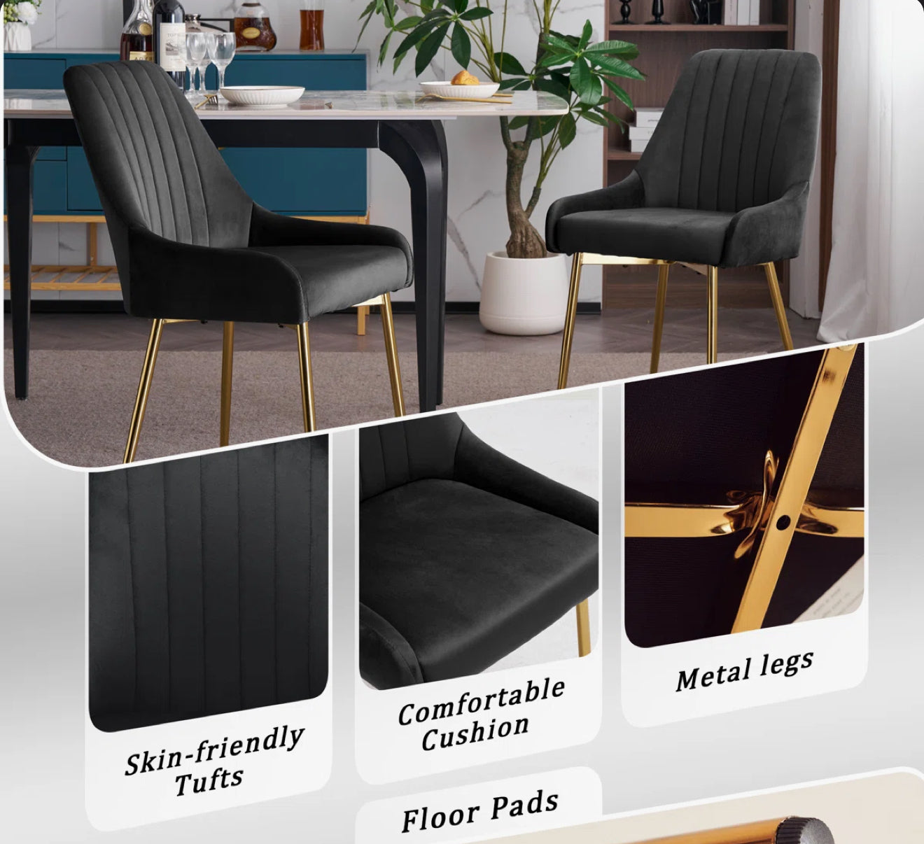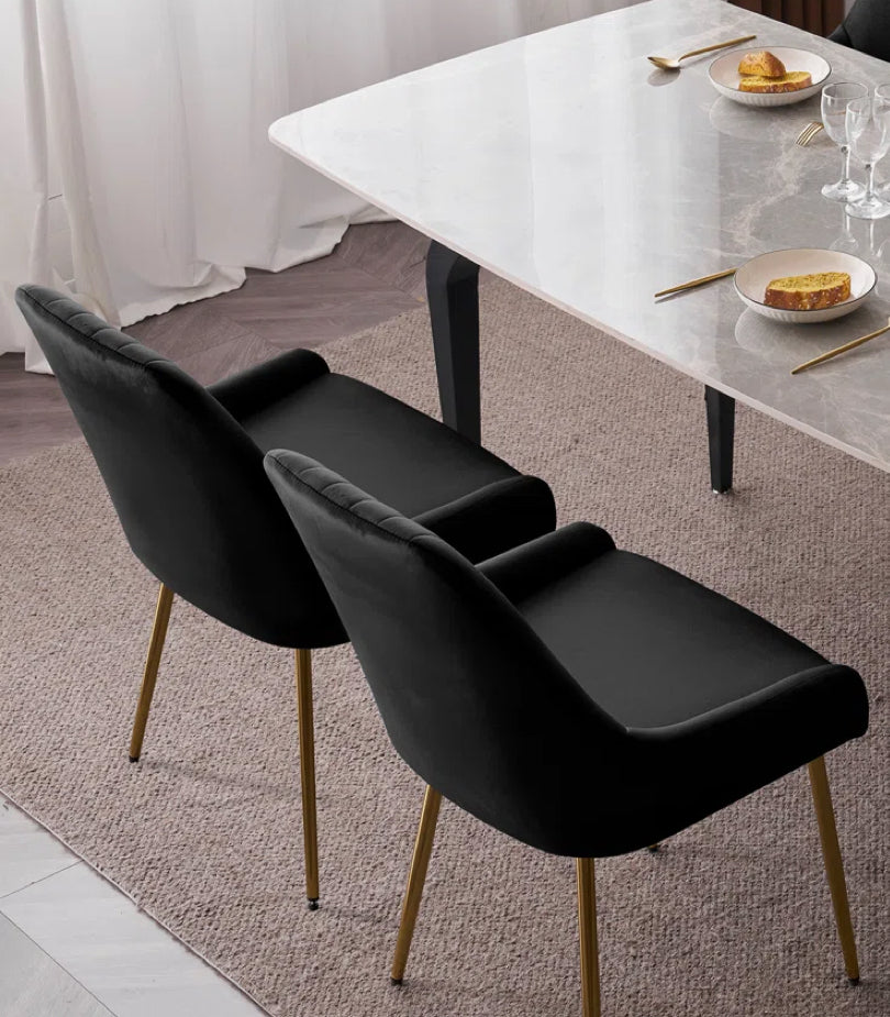 -The soft and luxurious velvet upholstery of the upholstered dining chairs is a complement to good food and better company at every meal and gathering.