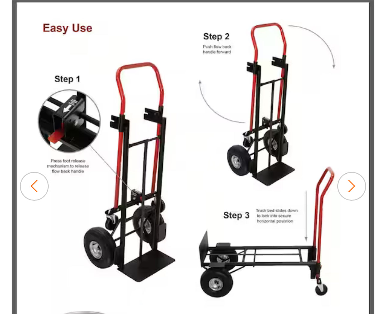 -Easily converts from vertical 2-wheel truck to 4-wheel platform position by pressing down with your foot on the handle release mechanism