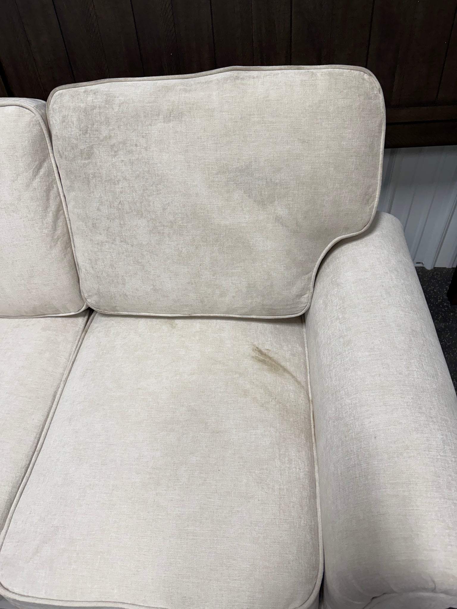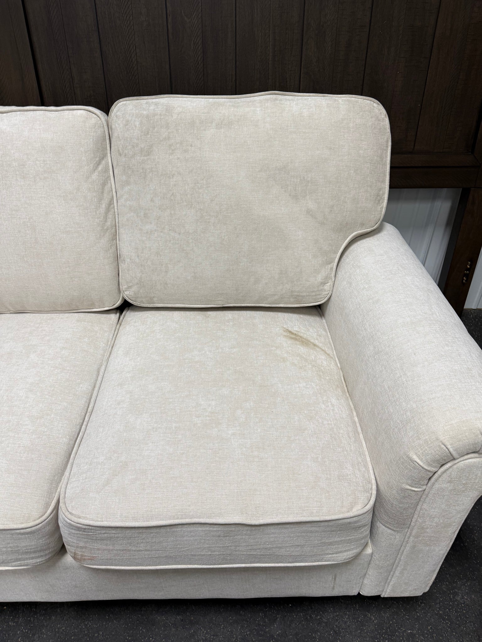 -Brand new, never used, but box was half ripped open when arrived to us. The butt and back cushion on the right are whats dirty, most of rest of couch is perfect, photos shown