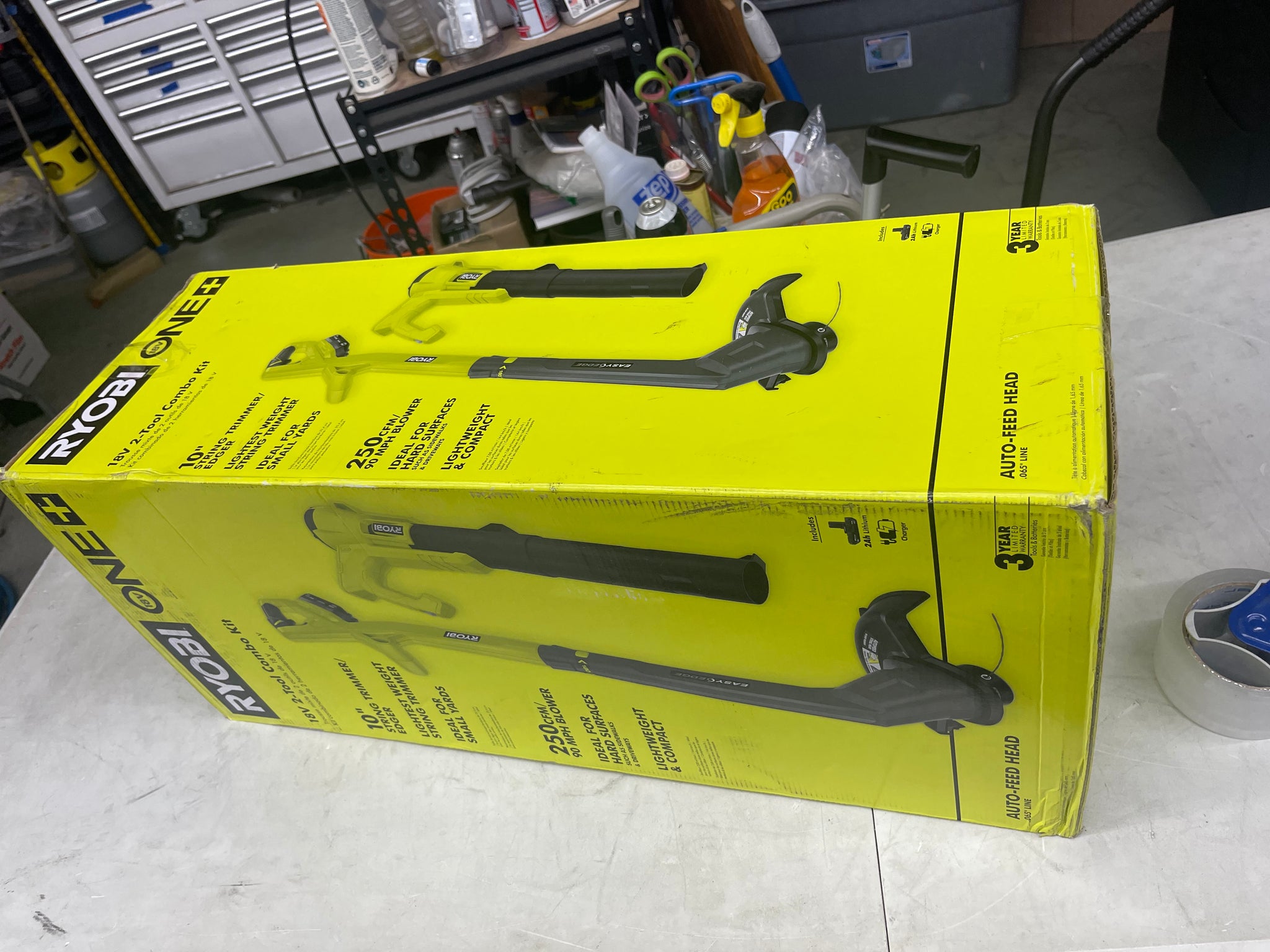 ONE+ 18V Cordless String Trimmer/Edger and Blower/Sweeper Combo Kit (2-Tools) with 2.0 Ah Battery and Charger by RYOBI- new in box