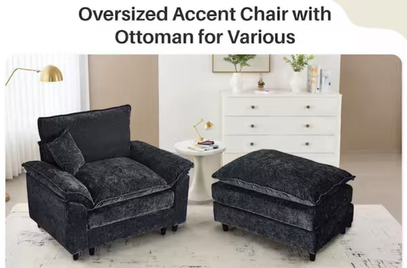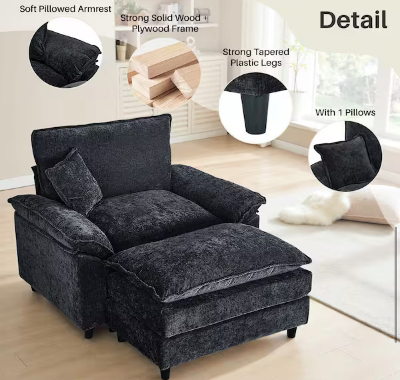 Oversized Black Chenille Soft Single Sofa Arm Chair with Ottoman and 1-Small Pillow for Bedroom and Living room! (NEW VACUUM SEALED IN BOX)