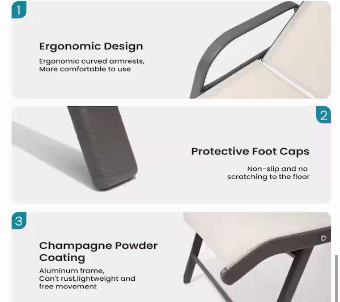 -Rustproof Aluminum Frame: Our lounge chairs are made entirely of aluminum frame , rustproof and lightweight. Maximum weight capacity is 265 lbs.