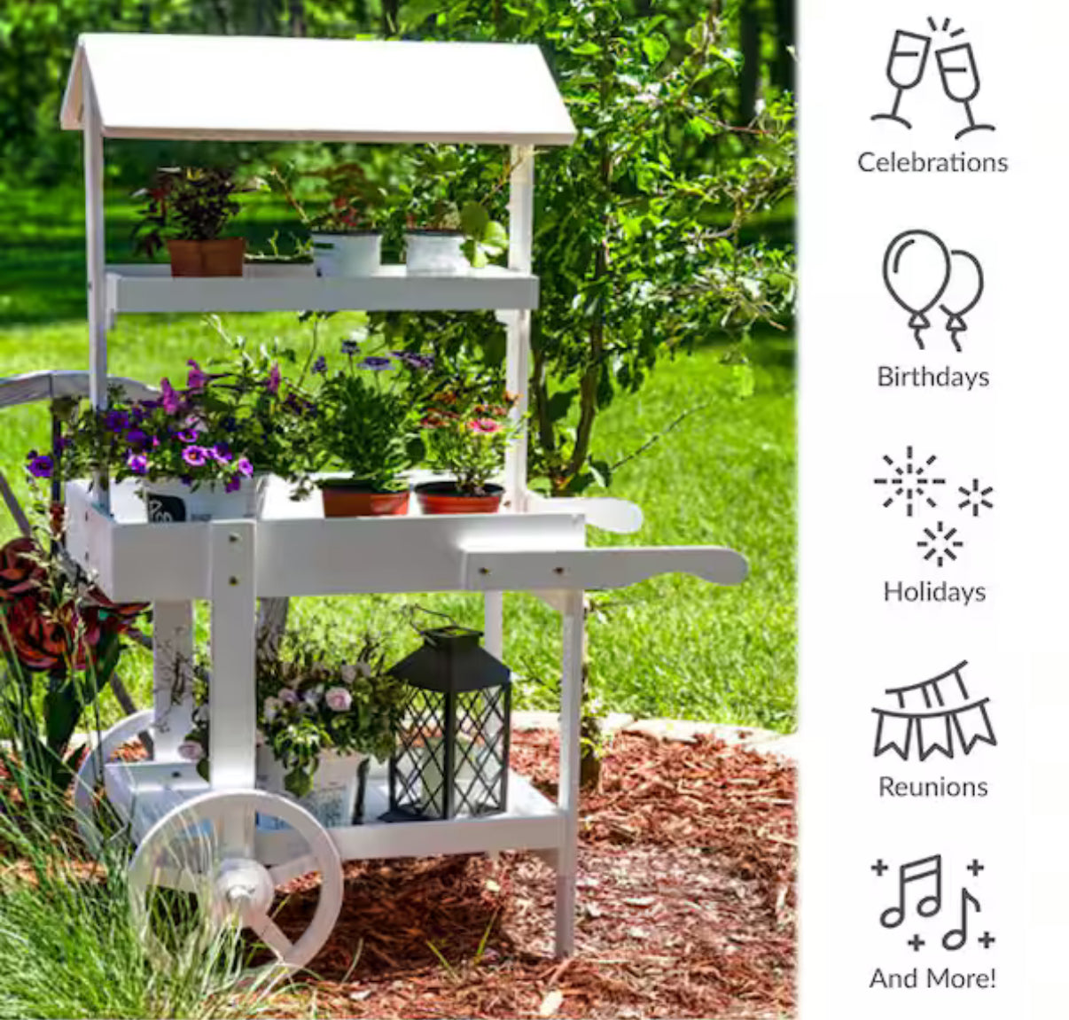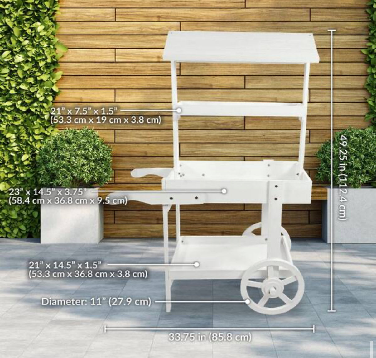 -2 shelves for convenient storage: the lower shelf and upper shelf of this flower cart display stand with wheels provides convenient places to store gardening tools and accessories, all hardware required for assembly is included, a philips screwdriver and wrench are required for assembly (not included)