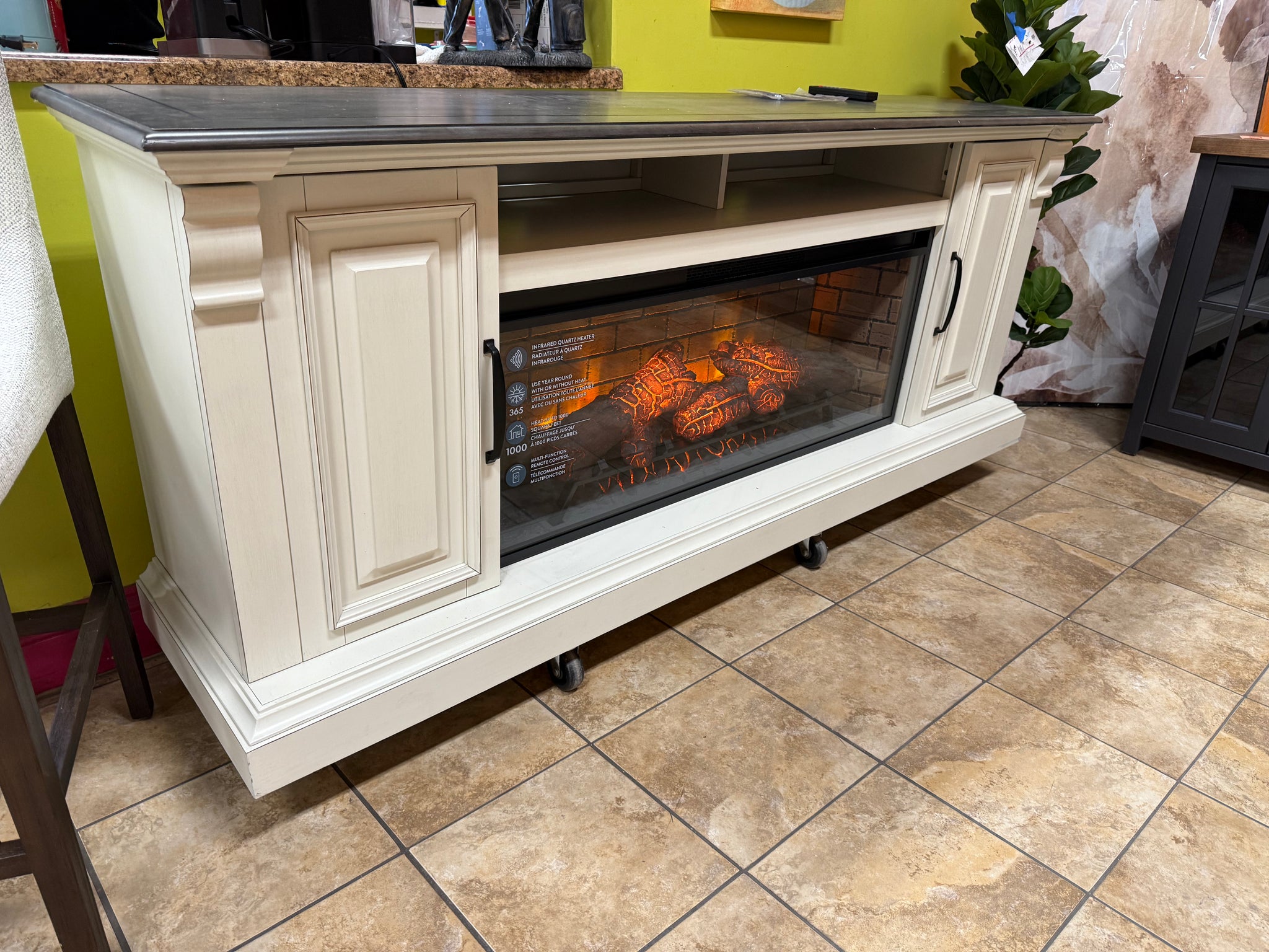 -The Tresanti Eloise 74" Fireplace Console is an elegant TV stand and entertainment center featuring the ClassicFlame electric fireplace system. This versatile media console supports most flat screen TVs up to 80 inches and 90 pounds, making it ideal for modern home theaters.