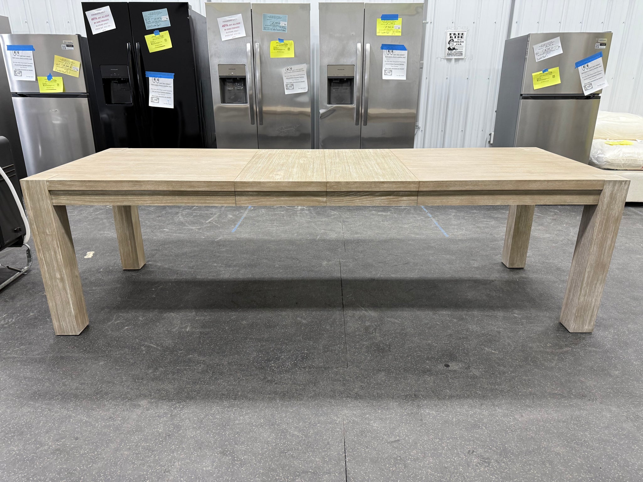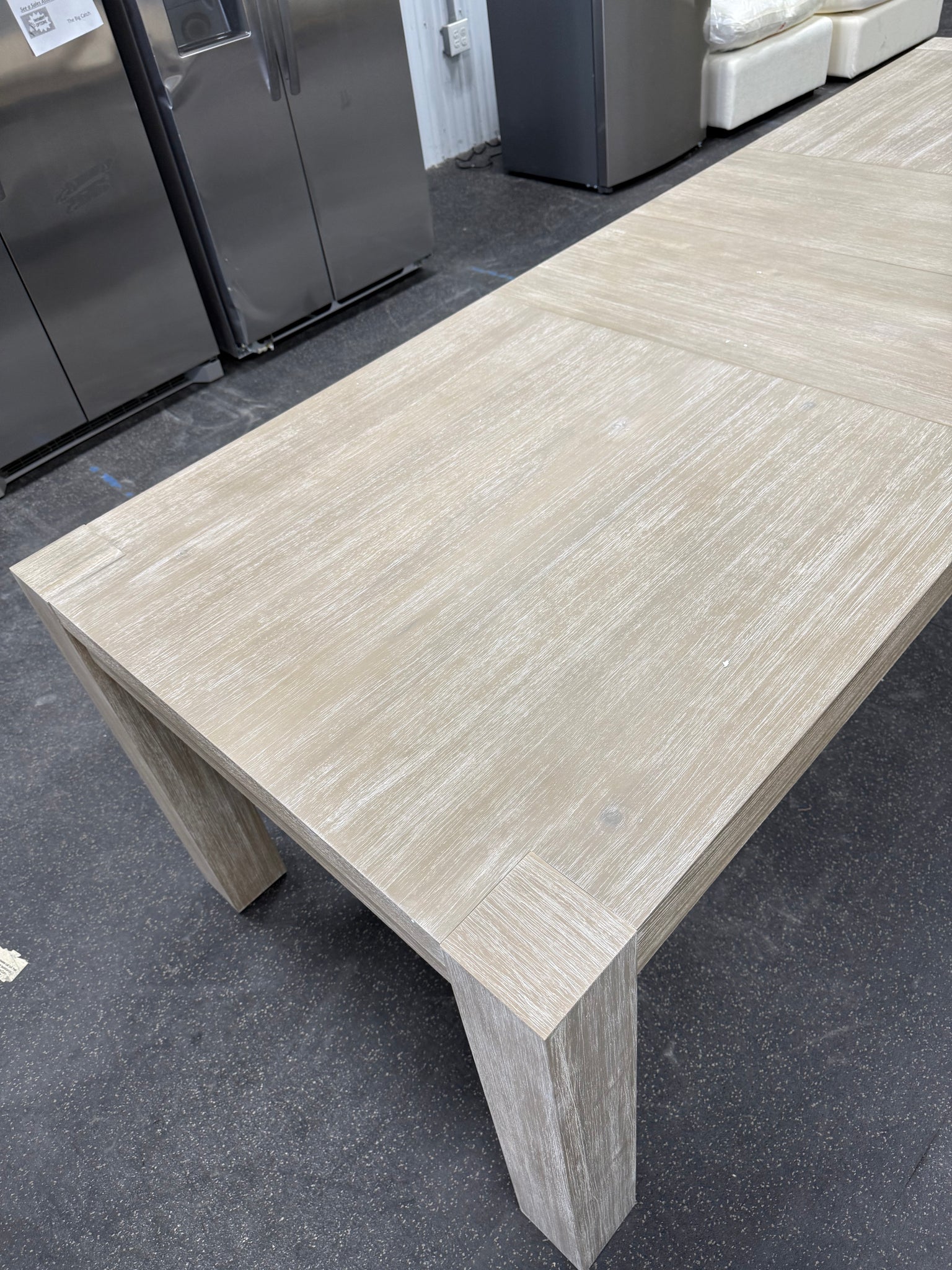 -Made of natural gray acacia wood and acacia veneer, this dinner table has thick wood legs that provide support at the half and full extension.